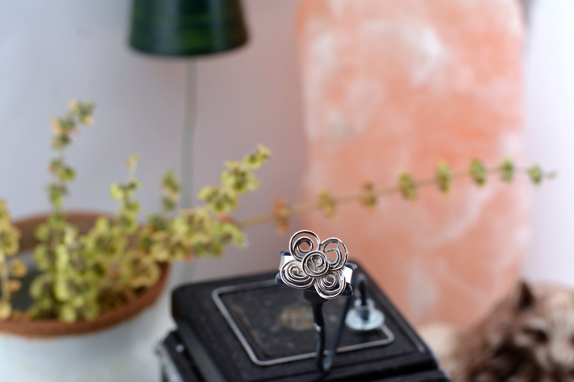 Design: Five spirals — four petals and a center bloom — soldered atop a sterling band